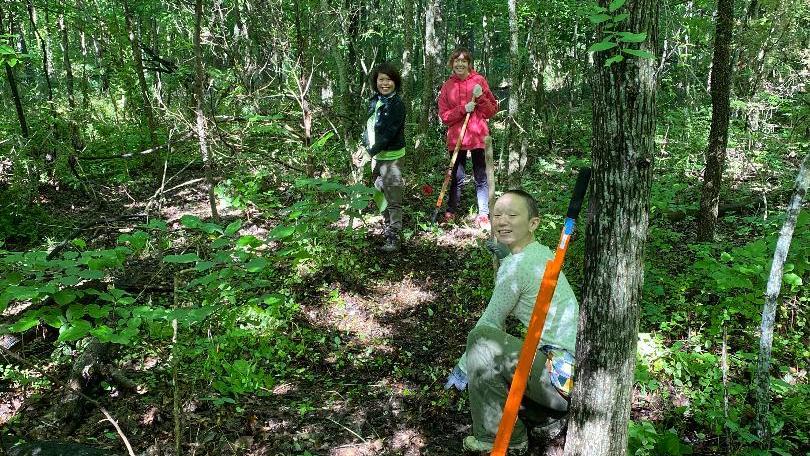 G.G. Norris, red shirt is Hannah Byers, Ying Wang, and Steve Boeding working to move the trail.