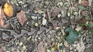 In the photo is a Broad-banded Copperhead, Agkistrodon contortrix laticinctus, usually 24”-36” long as adults. These snakes are carnivorous and eat a mixed diet consisting of many things from small mammals such as rodents, to insects. They prefer wooded lowlands near water. Their bite is toxic and quite painful, so please keep several feet away if you happen to spot one. Medical treatment should be sought right away.